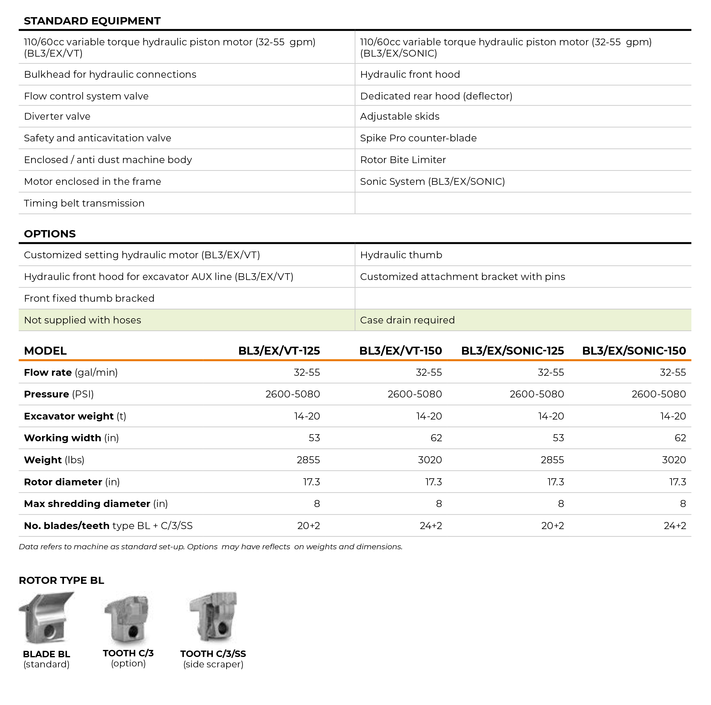 BL3/EX/VT for 14-20 ton excavators mulches trees with a max. diameter of 8 in and is available in two working widths: 49 in and 59 in. The rotor features Bite Limiter technology. Steel limiter rings limit the depth of cut, which reduces power demand and guarantees speed and exceptional performance. The heat-treated forged-steel BL blades are durable and can be sharpened, lowering operating costs. BL3/ EX/VT has a 110/60 cc VT (Variable Torque) motor for noticeably better performance, increased torque when needed, and minimal risk of rotor stalling.