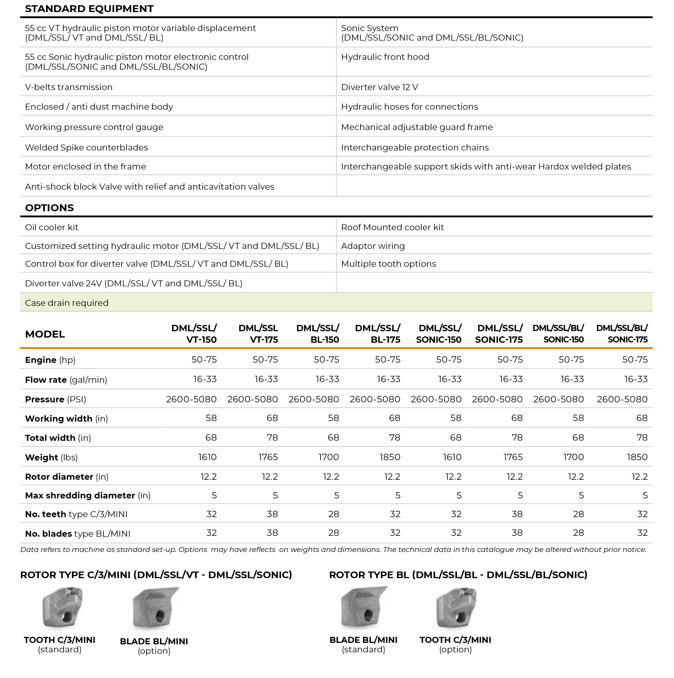 The DML/SSL forestry mulcher, designed for skid steer from 50 to 75 hp, is able to shred material up to 5” in diameter. This head is ideal to have high productivity in vegetation management and provide high shredding capacity in wooded and forestry areas, where the agility and compactness of a skid steer is required. The head is designed to offer high productivity, durability and ease of maintenance for the operator. The DML/SSL is available in VT version with fixed tooth rotor or in BL version with Bite Limiter rotor with fixed blades. For the VT or BL versions, Sonic technology is available, a FAE exclusive.
