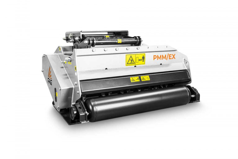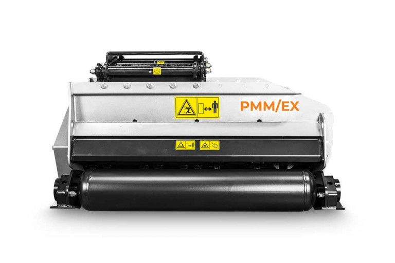 The PMM/EX is a flail mower used to mulch underbrush, grass and bushes. It is equipped with a variable manual displacement hydraulic piston motor that can be set to the carrier’s hydraulic specifications. The stronger roller supports (optional) ensure the best performance and maximum reliability on difficult terrain. The flow control valve ensures minimal setup of the mulcher without adjustments or modifications to the hydraulic system of the excavator.