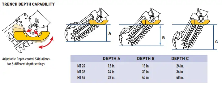 The Auger Torque MT Trencher Range has adjustable trenching depth capabilities to cover a wider range of applications. MT 48 trenchers can be set to 32″, 40″ and 48″ depths.