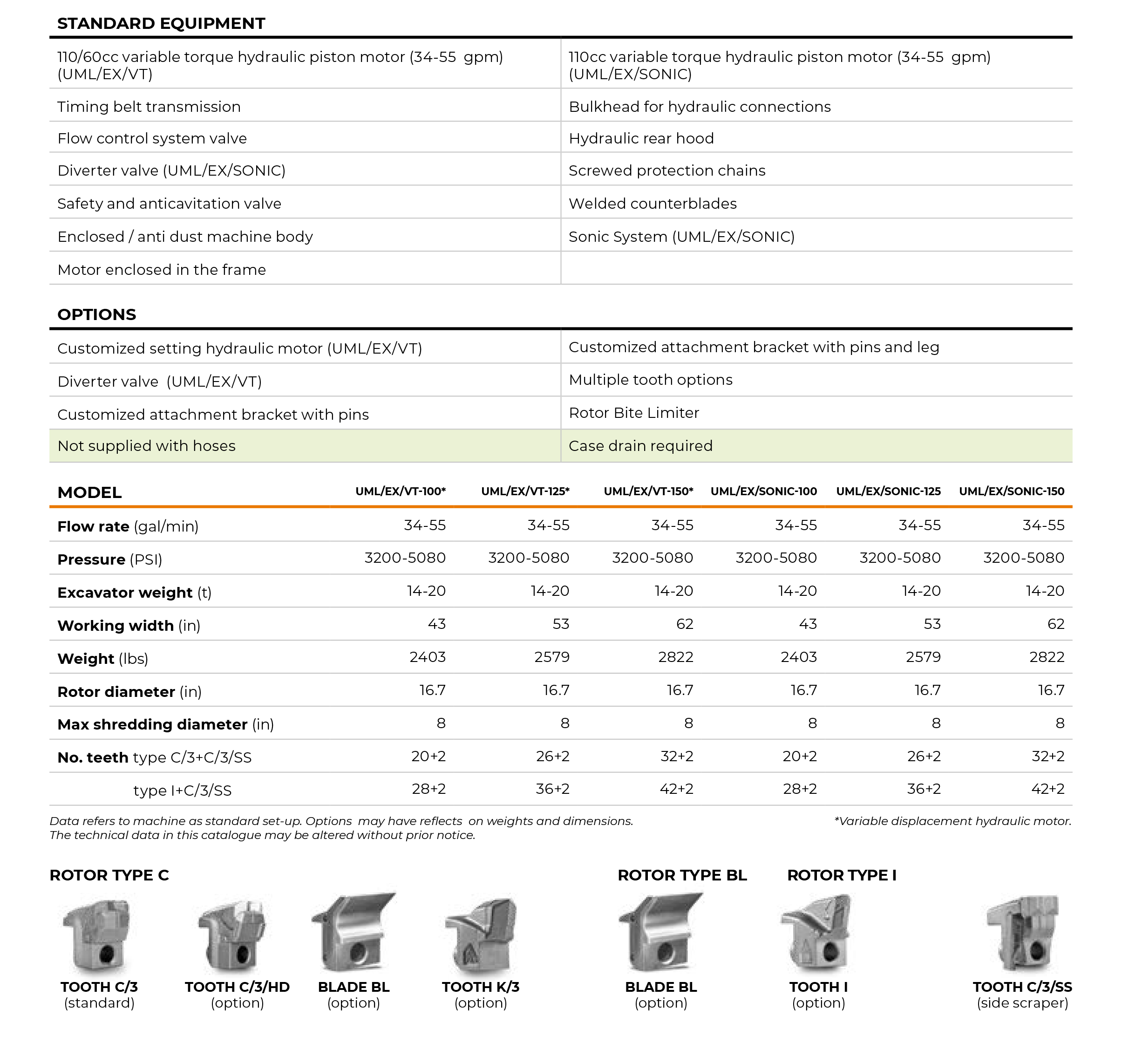 Thanks to its size, heavy duty construction, reliability and performance, the UML/EX is one of FAE’s most popular attachments.
