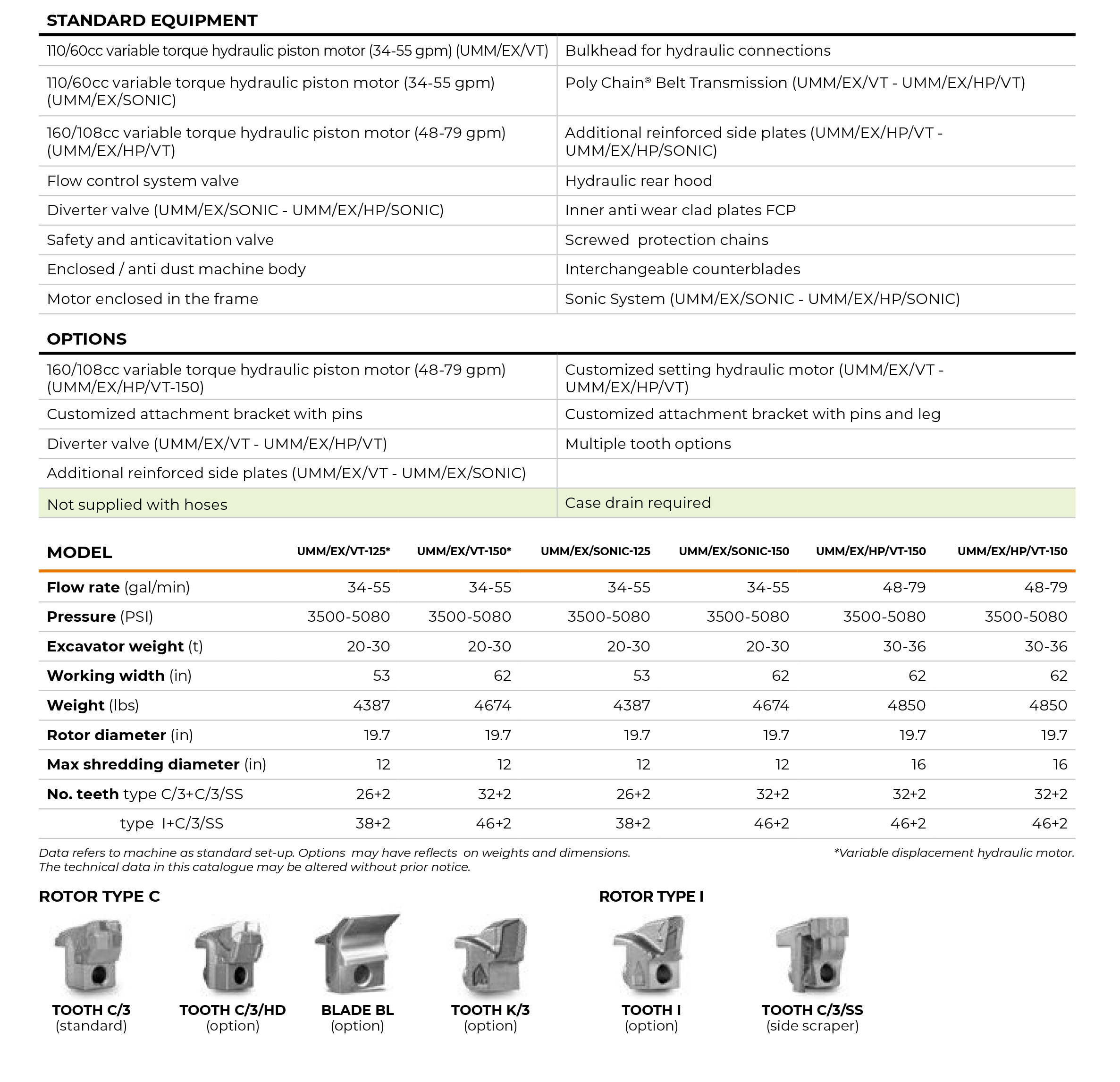 The UMM/EX/VT – UMM/EX/SONIC – UMM/EX/HP/VT – UMM/EX/HP/SONIC mulchers are great for mulching vegetation and trees with a max. diameter of 16 in and are compatible with excavators from 20 to 36 t. Their hydraulic capacity ranges from 34 to 79 gal/min.