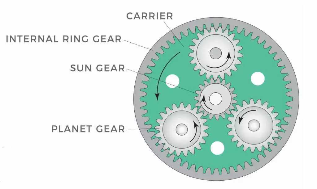 This motor is then matched with a planetary gearbox in order to amplify the torque output. A planetary gearbox is a common gearbox setup that transfers a high speed, low torque input into a low speed, high torque output. Keep in mind that more torque is the name of the game when it comes to drilling holes.